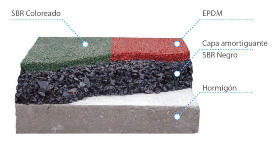 • Superficie antideslizante: Las superficies de caucho, especialmente las que tienen una textura, previenen resbalones y caídas, lo cual es crucial en un área de juego.